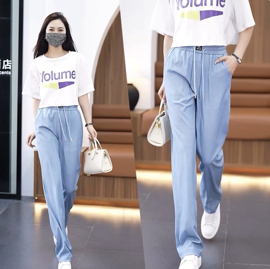 窄版冰絲闊腿褲女夏季薄款高腰顯瘦垂感休閑褲寬松大碼直筒長褲子